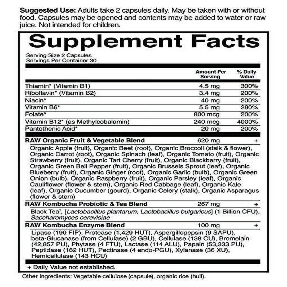 It may sound like the latest dance craze to you but kombucha, in the form of a fermented tea beverage, has long been touted in the Far East for its health benefits. Over the past few years, however, it has really gained notoriety in the U.S. Now, Garden of Life offers the dynamic benefits of kombucha in a more convenient and more affordable pill form. One serving of Vitamin Code RAW Kombucha provides you with at least 200% of the Recommended Daily Value of seven B vitamins, which promotes energy. It contains the powerful probiotic Saccharomyces boulardii as well as a plethora of enzymes. These live, raw probiotics and enzymes provide powerful digestive support and immune support. Vegan. Sugar free. Gluten free.