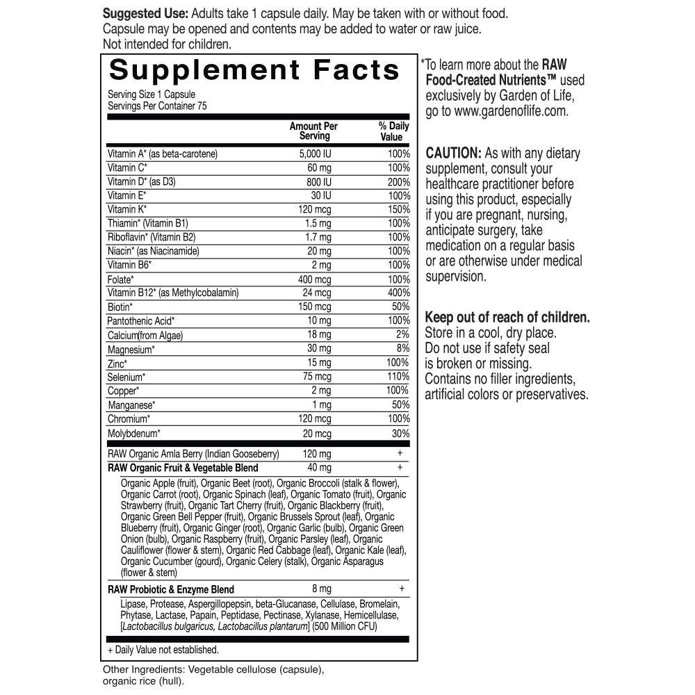 Made with individually ?grown? nutrients utilizing probiotic cultivation to produce RAW Food-Created Nutrients?, Vitamin Code supplements are delivered in a whole food base of fruits and vegetables. Vitamin Code supplements are RAW, which not only means that they are produced below 115º F, but also means that these nutrients come with their natural cofactors, along with live probiotics and enzymes, just like raw foods! Vitamin Code raw powders are delivered in capsules without any binders or fillers?everything you want and nothing you don?t want. Vitamin Code RAW ONE for Men is whole food nutrition, specifically formulated to meet the unique needs of men on-the-go and to deliver the nutrition men require for meeting the demands of life. 24 fruits and vegetables add supporting antioxidants, vitamins and nutrient cofactors. RAW means no high heat, synthetic binders, fillers, artificial flavors, sweeteners, colors or additives commonly used in tablets. Whole food means RAW Food-Created Nutrients are blended in a base of 24 fruits and vegetables together with food cofactors.