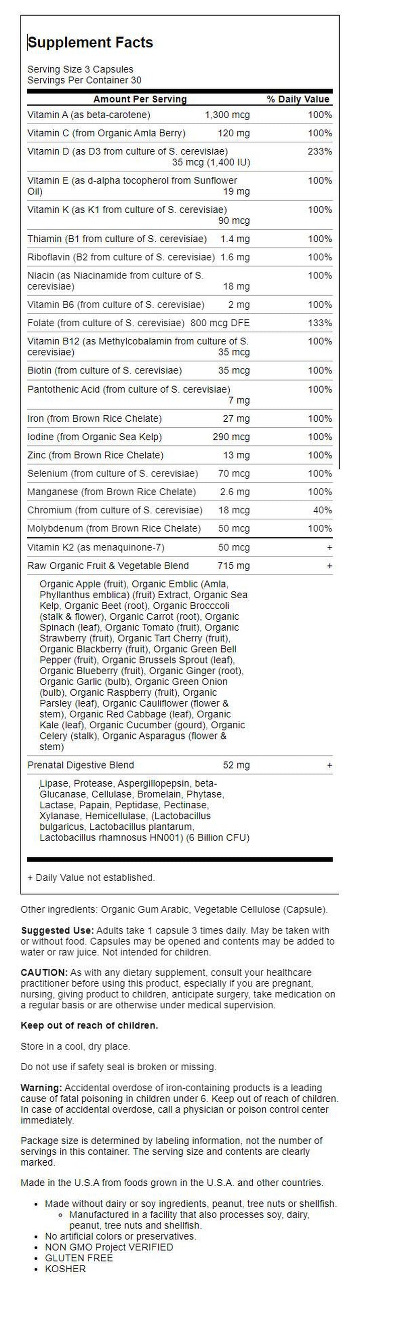 Vitamin Code RAW Prenatal is a comprehensive, whole-food multi-nutrient formula, specifically formulated to meet the unique needs of women during pre-conception, pregnancy and lactation, providing the nourishment to support both mom and her developing baby. RAW means no high heat, synthetic binders, fillers, artificial flavors, sweeteners, colors or additives commonly used in tablets. Whole food means RAW Food-Created Nutrients? are blended in a base of 23 fruits and vegetables together with food cofactors.