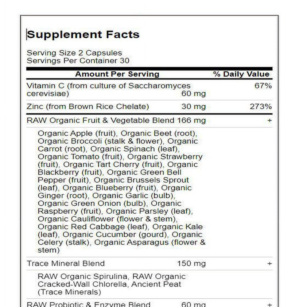 Made with individually grown nutrients utilizing probiotic cultivation to produce RAW Food-Created Nutrients?, Vitamin Code supplements are delivered in a whole food base of fruits and vegetables. Vitamin Code supplements are RAW, which not only means that they are produced below 115º F, but also means that these nutrients come with their natural cofactors, along with live probiotics and enzymes, just like raw foods! Vitamin Code raw powders are delivered in capsules without any binders or fillers?everything you want and nothing you don?t want. Vitamin Code RAW Zinc is whole food nutrition, specifically formulated with 30mg of high potency whole food zinc along with vitamin C, providing 200% of the Daily Value for zinc plus 100% of the daily value for vitamin C. RAW means no high heat, synthetic binders or fillers, artificial flavors, sweeteners, colors or additives commonly used in tablets. Whole food means RAW Food-Created Nutrients are blended in a base of 23 fruits and vegetables together with food cofactors plus 75 alkalizing trace minerals to add supporting antioxidants, vitamins and nutrient cofactors.