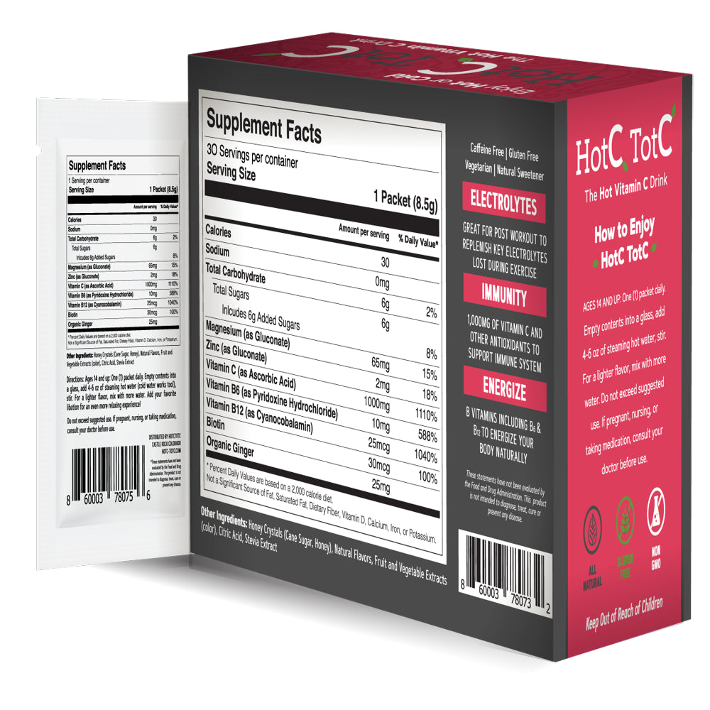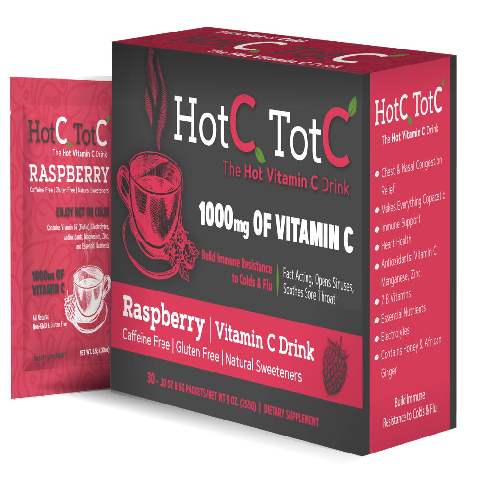 HotC TotC features an enhanced immune support formula that’s packed with key nutrients to fortify your natural defenses. One serving provides 1,000 mg Vitamin C (1110% d/v), 2 mg of Zinc (18% d/v), 65 mg of Magnesium (15% d/v), 10 mg Vitamin B6 (588% d/v), 25mcg of Vitamin B12 (1040% d/v), and electrolytes to hydrate you. HotC TotC is made right here in the United States, contains all natural, GMO free, and vegan ingredients. With refreshing and tasty flavors, the HotC TotC Vitamin C powdered drink mix makes it deliciously easy to support ongoing wellness goals. Mix with 4 to 6 ounces of steaming hot water to create a soothing, hot, and congestion relieving cup of tea. • Includes 30 single-serving packets (0.31 oz. each) of HotC TotC in Raspberry flavor. • An Enhanced Immune Support Formula with 1,000 mg of Vitamin C, plus Magnesium and Zinc • Packed with more Vitamin C than 10 oranges to support your immune system • Made with natural fruit flavors for a delicious Raspberry flavor vitamin mix • Vitamin C drink mix dissolves quickly in water; it’s warm, soothing and caffeine-free • Contains B Vitamins, Electrolytes, and other Antioxidants like Zinc and Magnesium