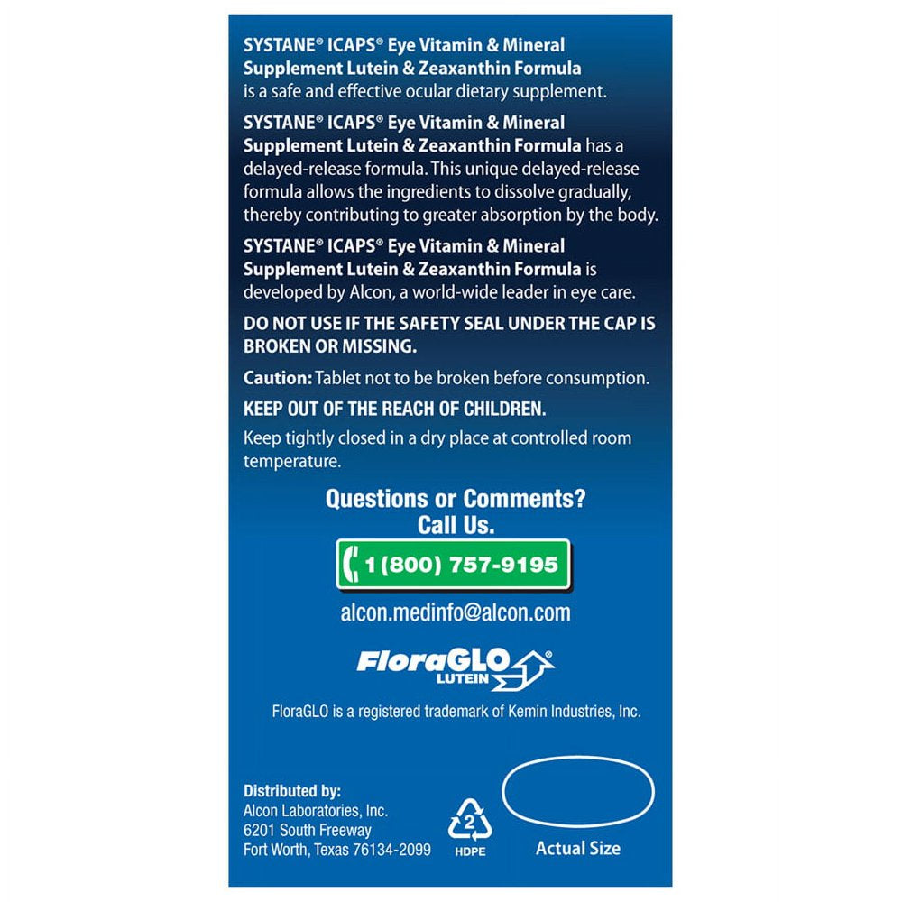 ICAPS® Eye Vitamin Lutein ; Zeaxanthin Coated Tablets. It promotes healthy Eyes™. It is a specialized, comprehensive formula of carotenoids, antioxidants, and minerals important to vision. Lutein and Zeaxanthin are natural carotenoids that have been shown through structural and clinical studies to be concentrated in the macular segment of the retina. These carotenoids are not produced by the human body, and their accumulation in the eye is dependent on dietary intake. Studies suggest a relationship between these two carotenoids and the maintenance of a normal healthy macula and clarity of the lens of the eye.