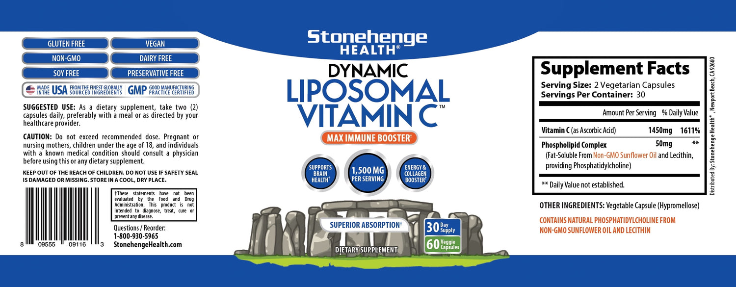 - ✔ HIGH POTENCY NON-GMO VITAMIN: Stonehenge Health Dynamic Liposomal Vitamin C contains 1,500 mg of superior quality and highly absorbable vitamin C per serving. Most brands use ordinary ascorbic acid, which does not get well absorbed in high doses. Our premium formula uses ascorbyl palmitate, which has been shown to have better absorption power.*