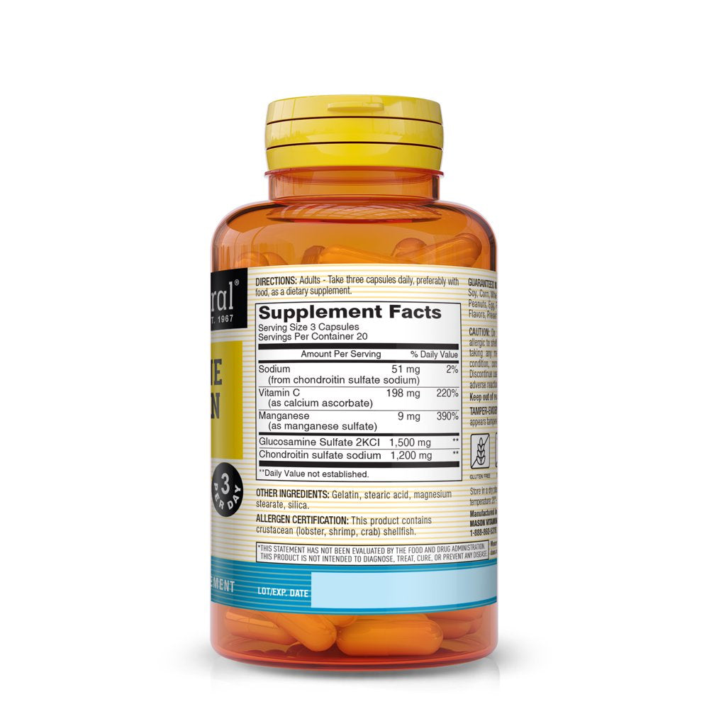 - Mason Natural Glucosamine Chondroitin capsules are formulated to provide 1500 mg of glucosamine and 1200 mg of chondroitin per dose which may help support joint health.