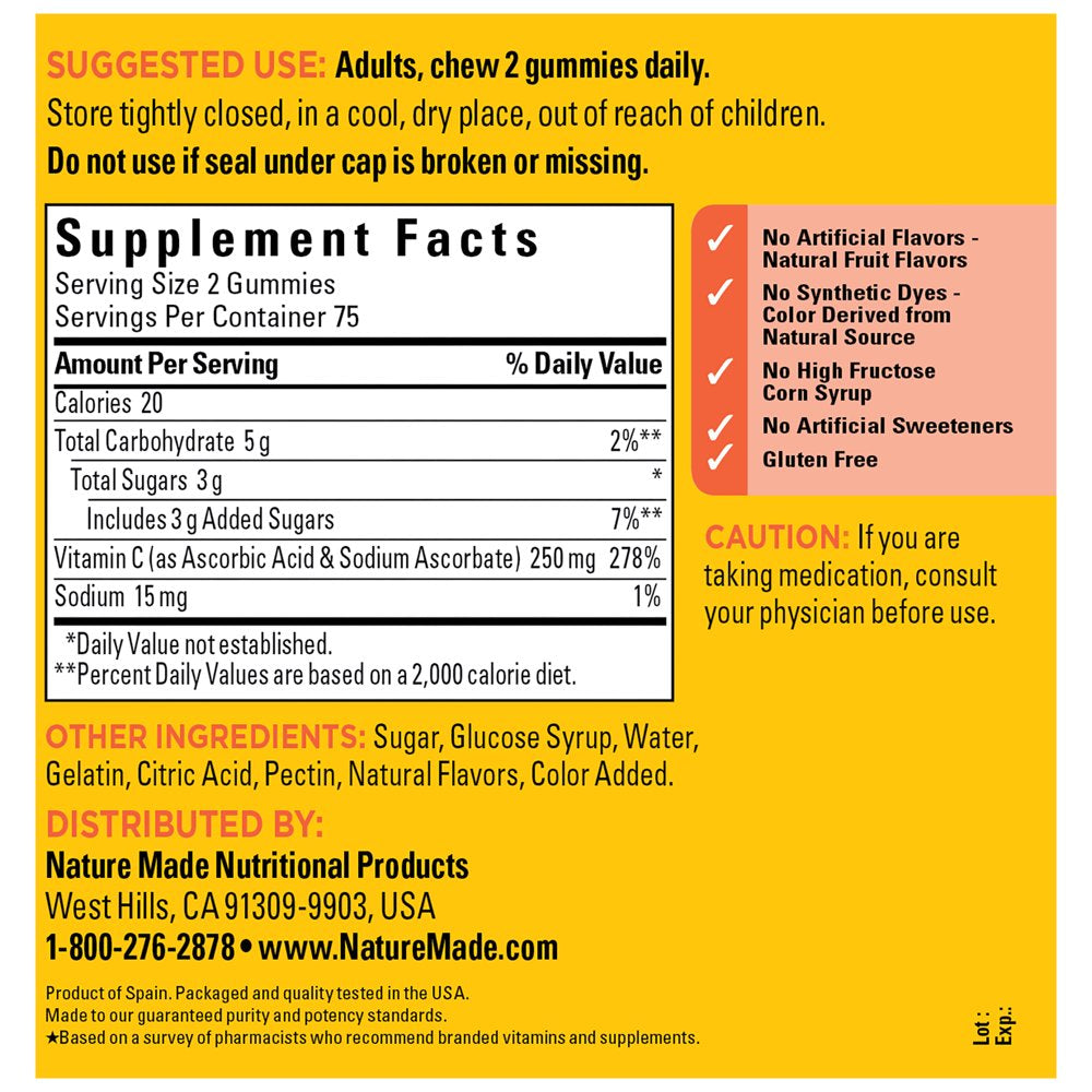 • Immune support supplement: contains one 150 count bottle of Nature Made Vitamin C 250 mg per serving Gummies for a 75-day supply