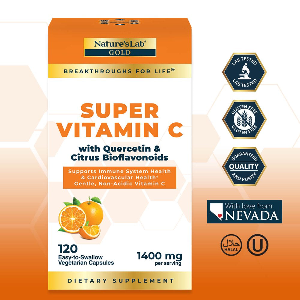 Nature’S Lab Gold Super Vitamin C 1000Mg – 120 Capsules (2 Month Supply) - Immune System Support – Contains Bioflavonoids Complex & Quercetin – Non-Acidic, Non-Gmo, Gluten Free, Vegan