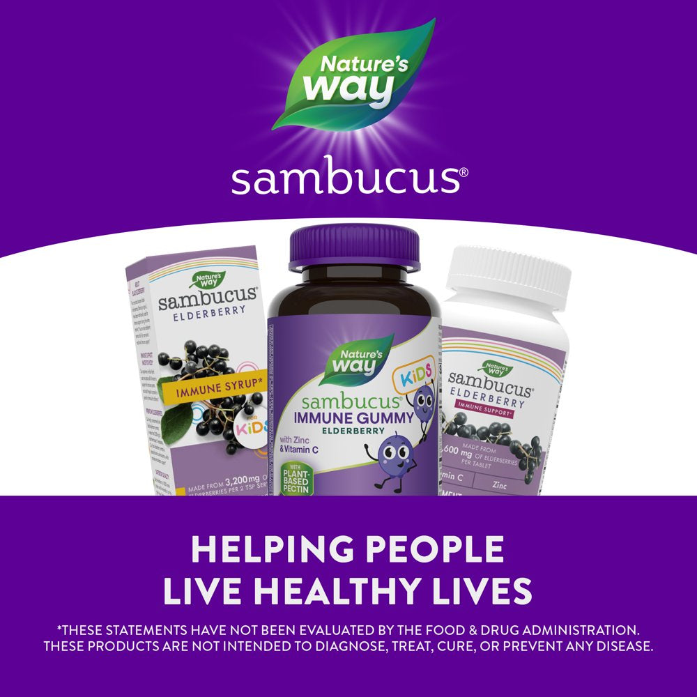 - Nature's Way Sambucus Immune Gummy for Kids for ages 2+ provides immune support with a blend of an excellent source of vitamin C and zinc, and also contain premium, highly concentrated black elderberry extract.*