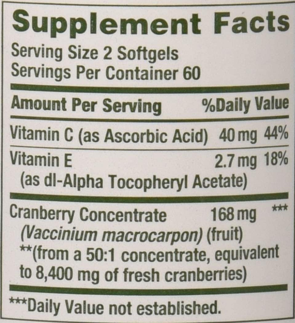 - CRANBERRY CONCENTRATE PILLS: Made from the finest cranberry concentrate available, Nature's Bounty Cranberry with Vitamin C softgel capsules each contain the equivalence to 4,200 mg of fresh cranberries, as well as 40 mg Vitamin C & 2.7 mg Vitamin E.