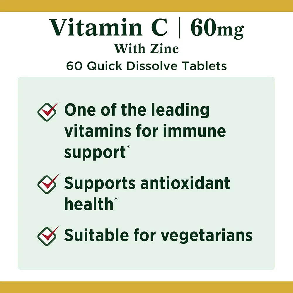 Nature'S Bounty Vitamin C + Zinc Quick Dissolve Tablets for Immunte Support, 60 Ct