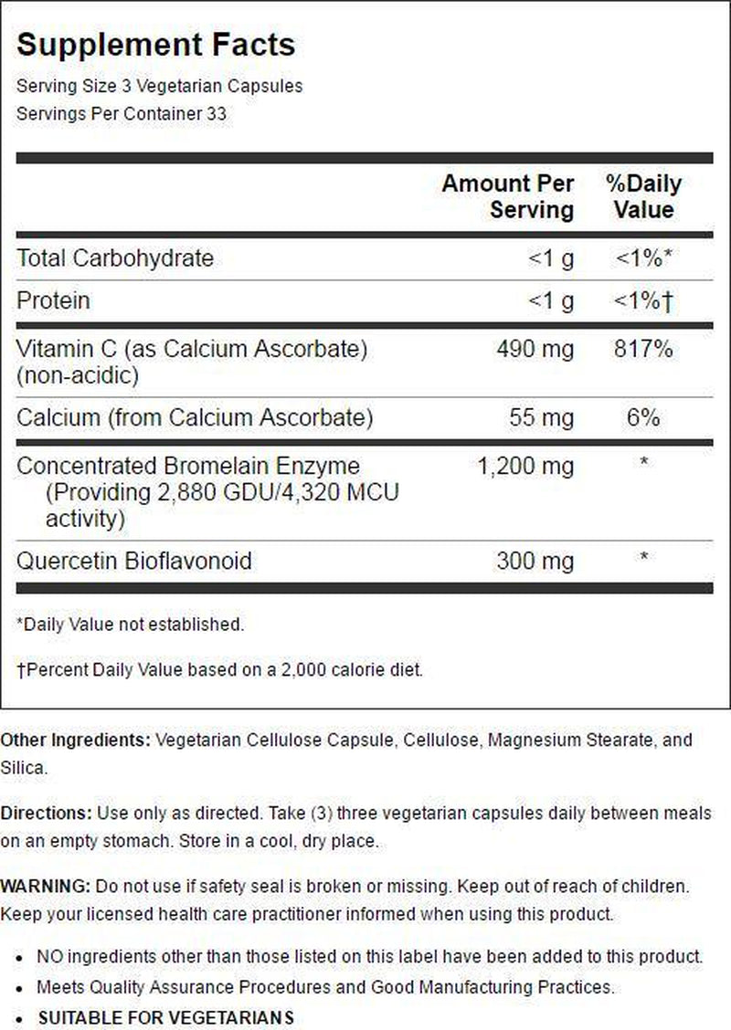 - Concentrated Formula: Each serving contains 1200mg Bromelain Enzyme, 300mg Quercetin, & 490mg Vit. C