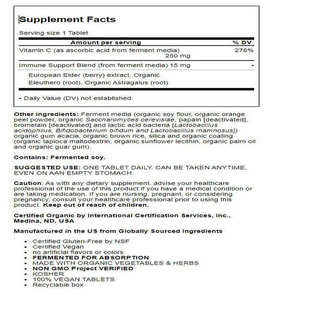 Unleash powerful antioxidant support with natural vitamin C tablets that are fermented for better absorption. You’ll get the most out of this high-quality, whole-food vitamin C because it’s fermented like no other—activating the nutrients for your body to absorb like food. Fermented Vitamin C is the one-daily immune system booster that also protects your natural collagen for firm, nourished skin.* Includes herbal immune support blend with superfood Black Elderberry extract. Non-GMO Project Verified.*These statements have not been evaluated by the Food and Drug Administration. This product is not intended to diagnose, treat, cure or prevent any disease.