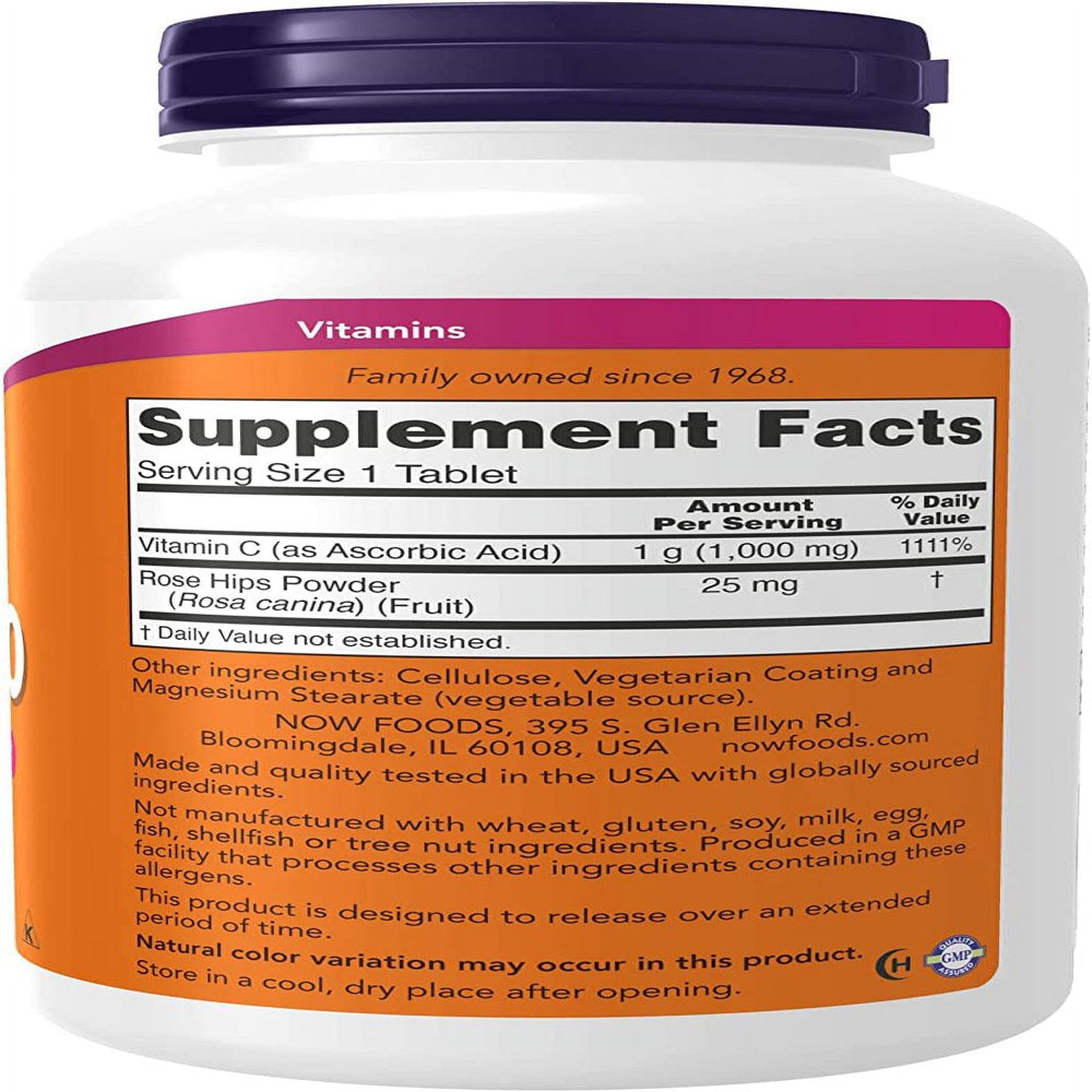 NOW Supplements, Vitamin C-1,000 with Rose Hips, Sustained Release, Antioxidant Protection*, 250 Tablets SUSTAINED RELEASE: NOW Vitamin C-1000 was specially formulated to provide a sustained release of vitamin C, known for its vital role in the immune system* | WITH ROSE HIPS: Added source of vitamin C! | CERTIFICATIONS/CLASSIFICATIONS: Vegan/Vegetarian, Quality GMP Assured, Non-GMO, Soy Free, Kosher | GMP Quality Assured: NPA A-rated GMP certification means that every aspect of the NOW manufacturing process has been examined, including our laboratory/testing methods (for stability, potency, and product formulation). | Packaged in the USA by a family owned and operated company since 1968 NOW Vitamin C-1000 was specially formulated to provide a sustained release of vitamin C and includes rose hips as an added source of vitamin C. Vitamin C is a water soluble nutrient well known for its vital role in the immune system.* Vitamin C is also necessary for the production of collagen (a structural protein in connective tissue) and is therefore important for skin, bone, and joint health.* Vitamin C is needed for amino acid metabolism, neurotransmitter synthesis, and the utilization of many nutrients, such as folic acid and iron.* It is also a highly effective antioxidant that can protect the body's cells and molecules from damage by free radicals and reactive oxygen molecules generated during normal metabolism and exposure to environmental stressors.* Take one tablet daily.
