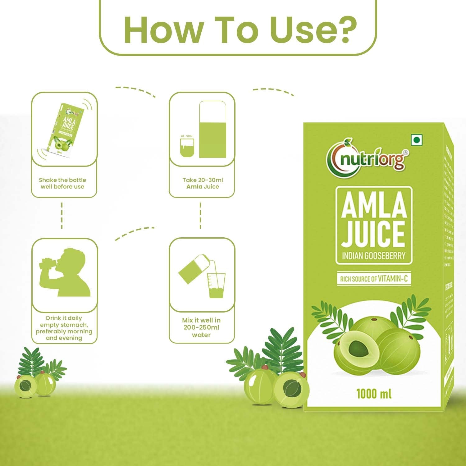 - HOW TO USE:- Mix 15-20 ml of Nutriorg Amla Juice in 200 ml of lukewarm water in a non-metallic pot and consume empty stomach twice a day preferably morning and evening.