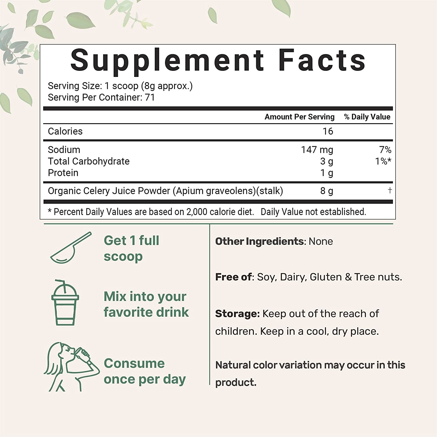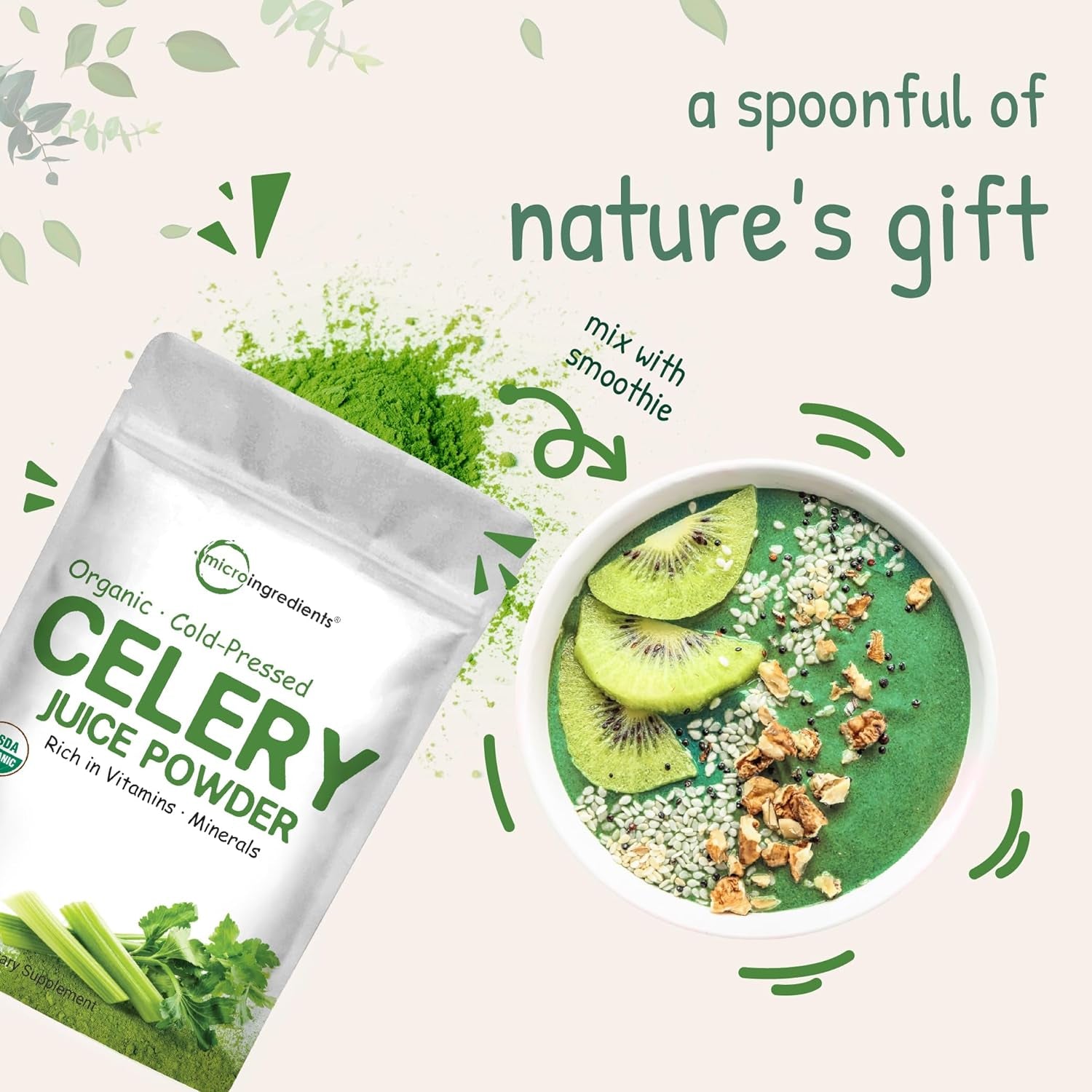 - Micro Ingredients Organic Celery Powder (Celery Juice Powder Organic), 20 Ounce (1.25 Pound), 71 Serving, Cold Pressed, Non-GMO and Vegan.