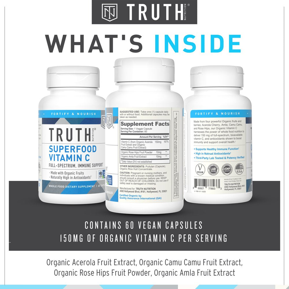 Made from four organic fruits—Amla, Acerola Cherry, Camu Camu, and Rose Hips—Truth Nutrition Organic Vitamin C harnesses the power of whole food nutrition to deliver 150 mg of organic vitamin C as well as hundreds of health-boosting phytonutrients that have been shown to increase bioavailability. This full-spectrum formulation has been 3rd party verified to ensure strength potency of 150mg organic Vitamin C per serving/capsule, providing powerful immune support and wellness benefits in a small daily dose that is gentler on the stomach than synthetic vitamin C supplements. Only the best for your health!