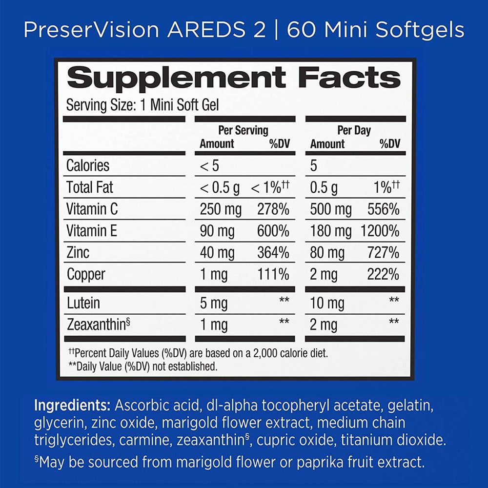 - PRESERVISION AREDS 2 EYE VITAMINS: This formula uses Lutein & Zeaxanthin, zinc, copper, Vitamin C & Vitamin E to exactly match the nutrient formula recommended by the AMD experts at the National Eye Institute based on the Age Related Eye Disease Study 2.