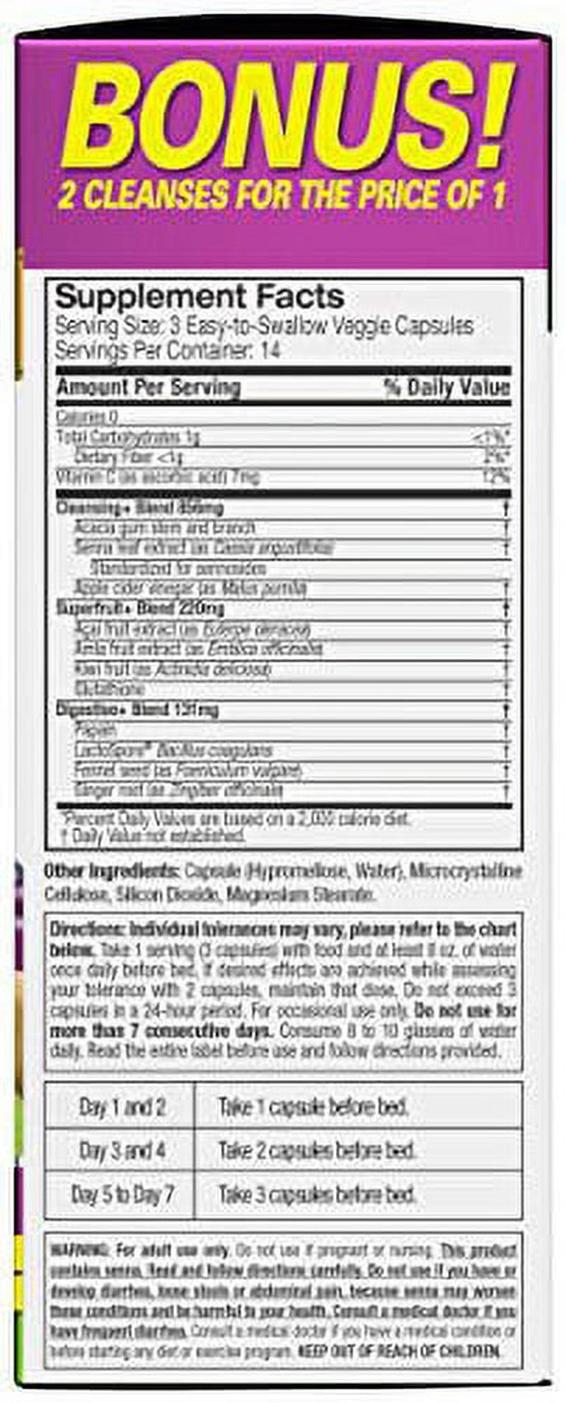 7 DAYS - This product is designed to assist the body in removing excess waste over the course of a 7-day period. CLEAN FORMULA - Contains a good source of the antioxidant vitamin C and includes the superfruits Brazilian açaí, amla and kiwi. PROBIOTIC - Contains a probiotic, a digestive enzyme, and the herbs ginger and fennel seed. SENNA - Senna is part of a large family of flowering plants that is native to tropical regions of the world, as well as a small number of species from more temperate regions. NON-STIMULANT - This formula is 99% caffeine free.