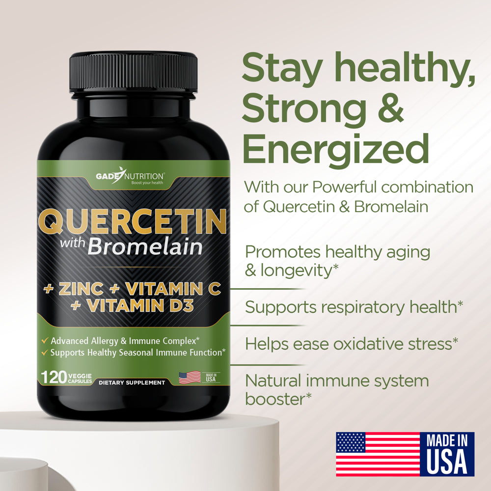 Gade Nutrition's Quercetin capsule is packed with 500 mg of Quercetin and 200 mg of Bromelain for respiratory support.* It also contains 22 mg of Zinc, 120 mg of Vitamin C & 25 mcg of Vitamin D to support an extra immune boost, antihistamine allergy relief, and antioxidant support.*