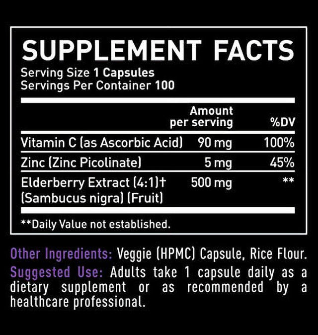 Sambucus Elderberry Capsule + Vitamin C with Zinc for Maximum Immunity Support* ? 500mg Elderberry Sambucus ? 90mg Vitamin C Ascorbic Acid ? 5mg Zinc Picolinate ?Vegan ?Gluten Free ?Made with Non-GMO