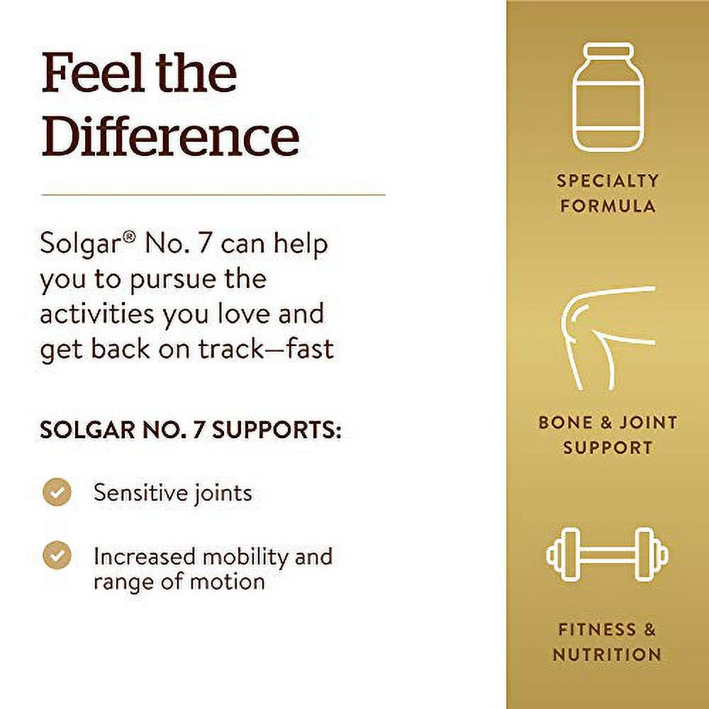• Easy-to-Ingest, Once-Daily Joint Support; Solgar No. 7 Joint Support & Comfort Supplement targets multiple pathways to balance the release of joint enzymes, structurally support collagen building blocks and help repair sensitive joint cartilage