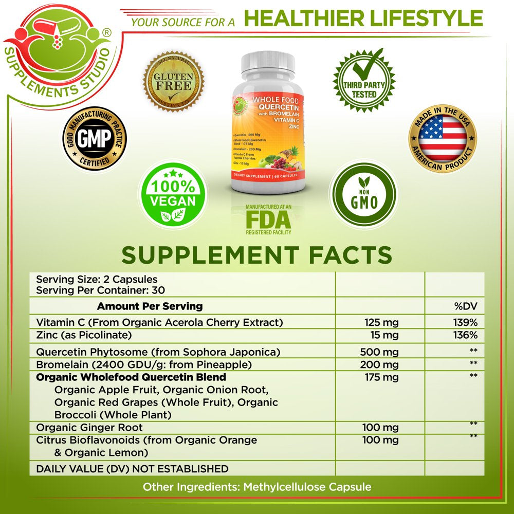 - ⭐ QUERCETIN WITH BROMELAIN COMPLEX: Formulated by our team of experts, our unique formula contains Quercetin 500mg + 175mg of an Organic Whole Food Quercetin Blend (sourced from raw fruits and veggies) + 15mg of Zinc Picolinate + 200mg of Bromelain from Pineapple + 100mg of Organic Ginger Root + 125mg of Vitamin C from Organic Acerola Cherries + 100mg of Citrus Bioflavonoids from Organic Orange & Organic Lemon.