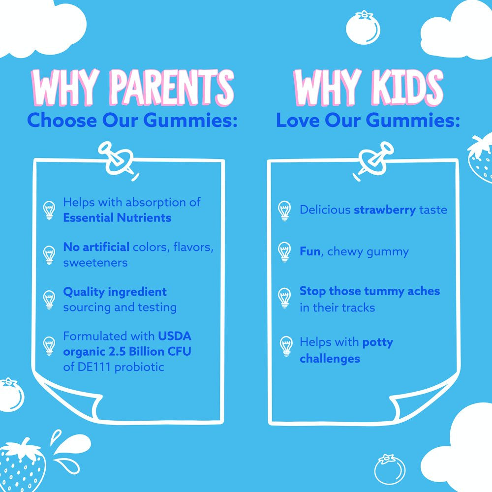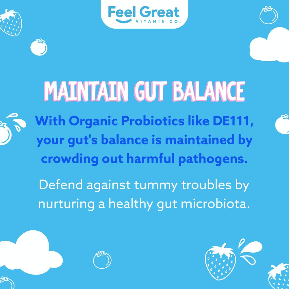 SCIENTIFICALLY PROVEN Here at Feel Great Vitamin Co, we want what’s best for you and your health! That’s why our adult probiotic gummies are certified organic, meaning they are carefully and completely formulated with USDA organic 5 Billion CFU of DE111 probiotic – the best and safest (30+ studies confirm the safety and efficacy of Bacillus subtillis DE111). A NEW DELICIOUS WAY TO GET YOUR PROBIOTICS If you're like most people, you simply don't enough eat foods and supplements that get provide them with the benefits of probiotics. These probiotic supplement gummies are pectin-based and have a delicious strawberry flavor that you'll love! GUT HEALTH AND BEYOND As the good bacteria in your gut, our Probiotic Gummies help keep intestines healthy*, improves digestion and nutrient absorption*, support normal digestion*, promote a healthy GI tract*, support regularity*, support normal bowel movements*, help protect against occasional constipation or diarrhea* and more.