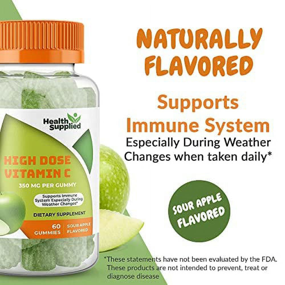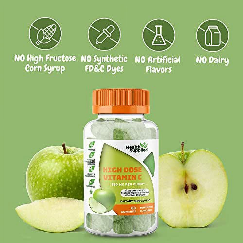 Sour Apple Vitamin C Gummies - Delicious and nutritious makes taking your daily Vitamin C much easier and more rewarding. These have 350mg of Vitamin C in ever gummy. Take up to 3 gummies per day for a big 1050mg of essential Ascorbic Acid. Works well to strengthen immunity. Especially important in cold and flu seasons to prevent missing work and school. Also helps support strong bones, teeth, heart, and blood pressure. This is safe with no GMO, gluten, or nuts. Kosher and Halal with naturally sourced flavors. Helps balance diet when you can't always fill up on the right fruits and veggies. Make sure you have several bottles of these 60 count gummies.