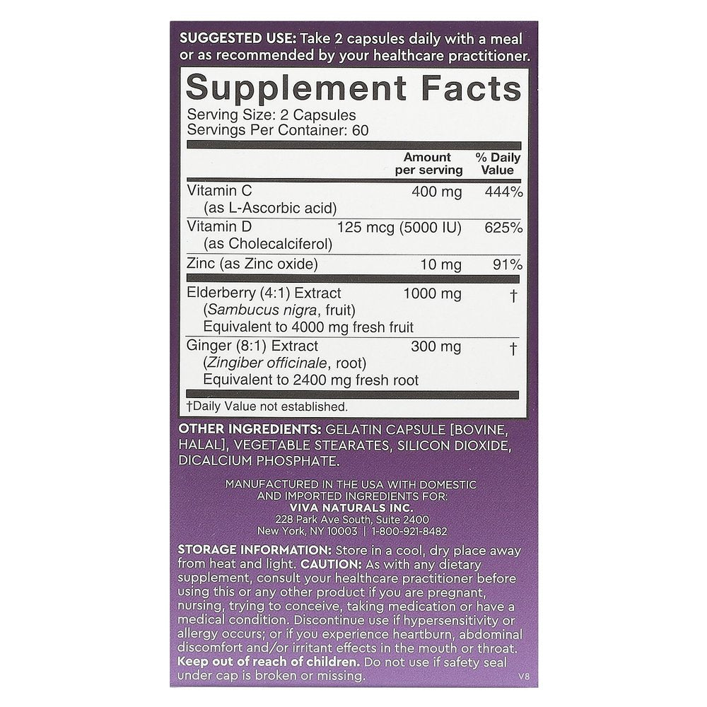 Details: If you’re looking for a super supplement that provides healthy immune system support and the added benefits of nutritious essential vitamins, give Viva Naturals Elderberry, Vitamin C + Zinc immunity supplements a try today!Unlike other elderberry supplements, gummies or even syrups, Viva Naturals’ powerful patent pending antioxidant formula combines the immune supporting benefits of not one, but five high-quality ingredients.* Each potent elderberry capsule contains:- 1000 mg of Black Elderberries (equivalent to 4000 mg of fresh fruit)- Vitamin D3 5000 IU- 400 mg of Vitamin C- Plus, a healthy serving of ginger and zinc oxideWith just two capsules daily, our powerful antioxidant formula can help maintain your healthy immune system year-round.*Viva Naturals Elderberry, Vitamin C +Zinc supplements are formulated with high-quality ingredients. This means no corn syrup or unwanted additives. Just a powerful antioxidant formula in convenient capsules.* Plus, it’s non-GMO and gluten and dairy-free.