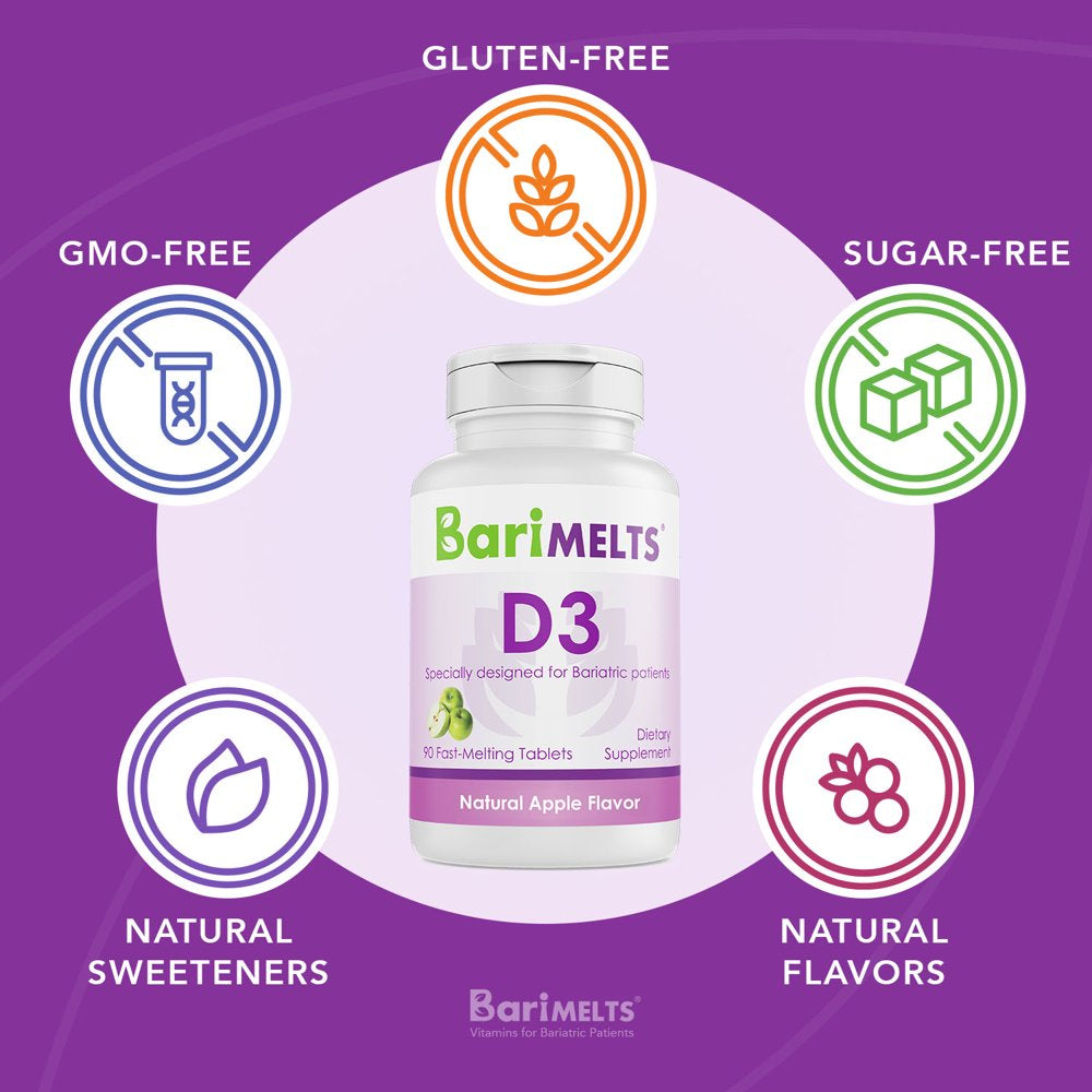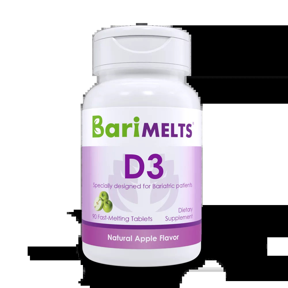 The BariMelts® delivery system is great for patients who have undergone bariatric surgery as it dissolves in the mouth and makes the vitamins available for absorption before they reach the stomach. Since the vitamins dissolve in the mouth, the tablet does not take up space in the stomach and allows you to eat a true meal. Some patients post-surgery may have difficulty swallowing and therefore this dosage form would help with that as well. D3 increases vitamin D levels in the body significantly while ergocalciferol only moderately increases levels. D3 is a naturally derived supplement while D2 is a synthetically derived supplement.