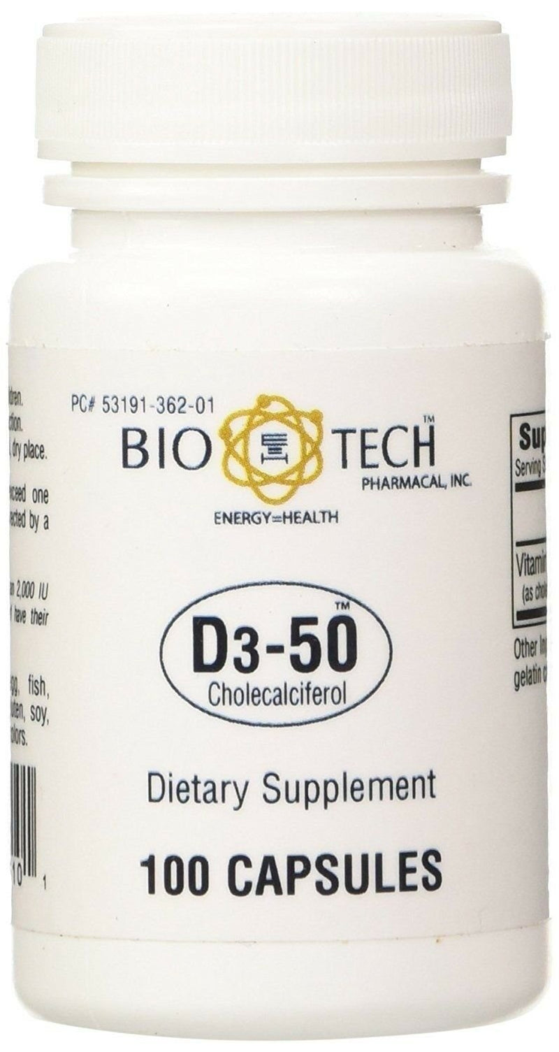 This listing is for 3 units.BioTech Pharmacal D3-50 50000 IU is natural cholecalciferol. Vitamin D functions as a hormone, a chemical messenger with widespread effects in the human body. It is important for optimal bone, cardiovascular, neuromuscular and immune health. Adequate calcium and vitamin D throughout life, as part of a well-balanced diet, may reduce the risk of osteoporosis. Supplementation with vitamin D may be necessary to meet daily needs, since obtaining sufficient vitamin D from natural food sources and sun exposure alone can be difficult. Research shows that vitamin D3 cholecalciferol is approximately 87% more potent than vitamin D2 for raising and maintaining vitamin D blood levels.A cholecalciferol formula50,000 IU 12,500% DV vitamin D3 per capsuleSeeks to provide support for normal bone growth and healthSeeks to provide cardiovascular, immune and neuromuscular supportFree of nuts, gluten and several other allergensHalal certified100 capsulesDry, water-soluble preparation of natural vitamin D3 cholecalciferol.More potent than vitamin D2 for raising vitamin D blood levels.