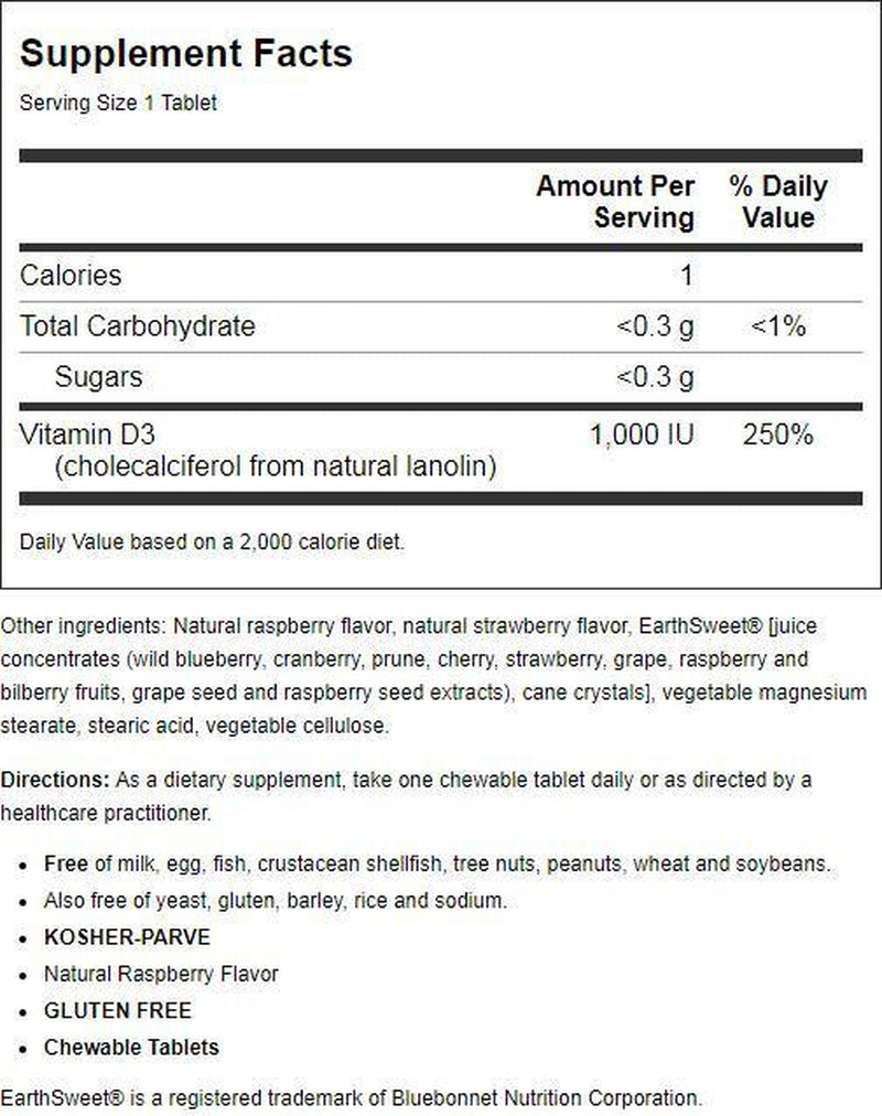 Bluebonnet Nutrition - Earth Sweet Chewable Vitamin D3 Natural Raspberry Flavor 1000 IU - 90 Chewable Tablets Supplement Facts Serving Size: 1 Tablet Servings Per Container: 90 Amount Per Serving %DV Calories 1 Total Carbohydrates <0.3g <1% Sugars <0.3g Vitamin D3 (cholecalciferol from natural lanolin) 1000 IU 250% *Daily Value Not Established.†Percent Daily Values are based on a 2,000 calorie diet. Your diet values may be higher or lower depending on your calorie needs. Other Ingredients: Natural raspberry flavor, natural strawberry flavor, EarthSweet® [juice concentrates (wild blueberry, cranberry, prune, cherry, strawberry, grape, raspberry and bilberry fruits, grape seed, raspberry seed extracts), cane crystals], stearic acid, vegetable cellulose, vegetable magnesium stearate. Free of milk, egg, fish, crustacean shellfish, tree nuts, peanuts, wheat and soybeans. Also free of yeast, gluten, barley, rice and sodium./div>