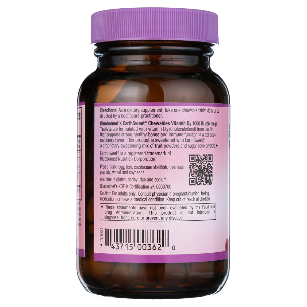 Non GMO Gluten Free Kosher Parve Bone & Immune Health Dietary Supplement With Other Natural Flavors Bluebonnet's EarthSweet® Chewables Vitamin D3 25 mcg (1000 IU ) Tablets are formulated with vitamin D3 (cholecalciferol) from lanolin that supports strong, healthy bones and immune function in a delicious raspberry flavor. Sweetened with EarthSweet®, a proprietary sweetening mix of fruit powders and sugar cane crystals.