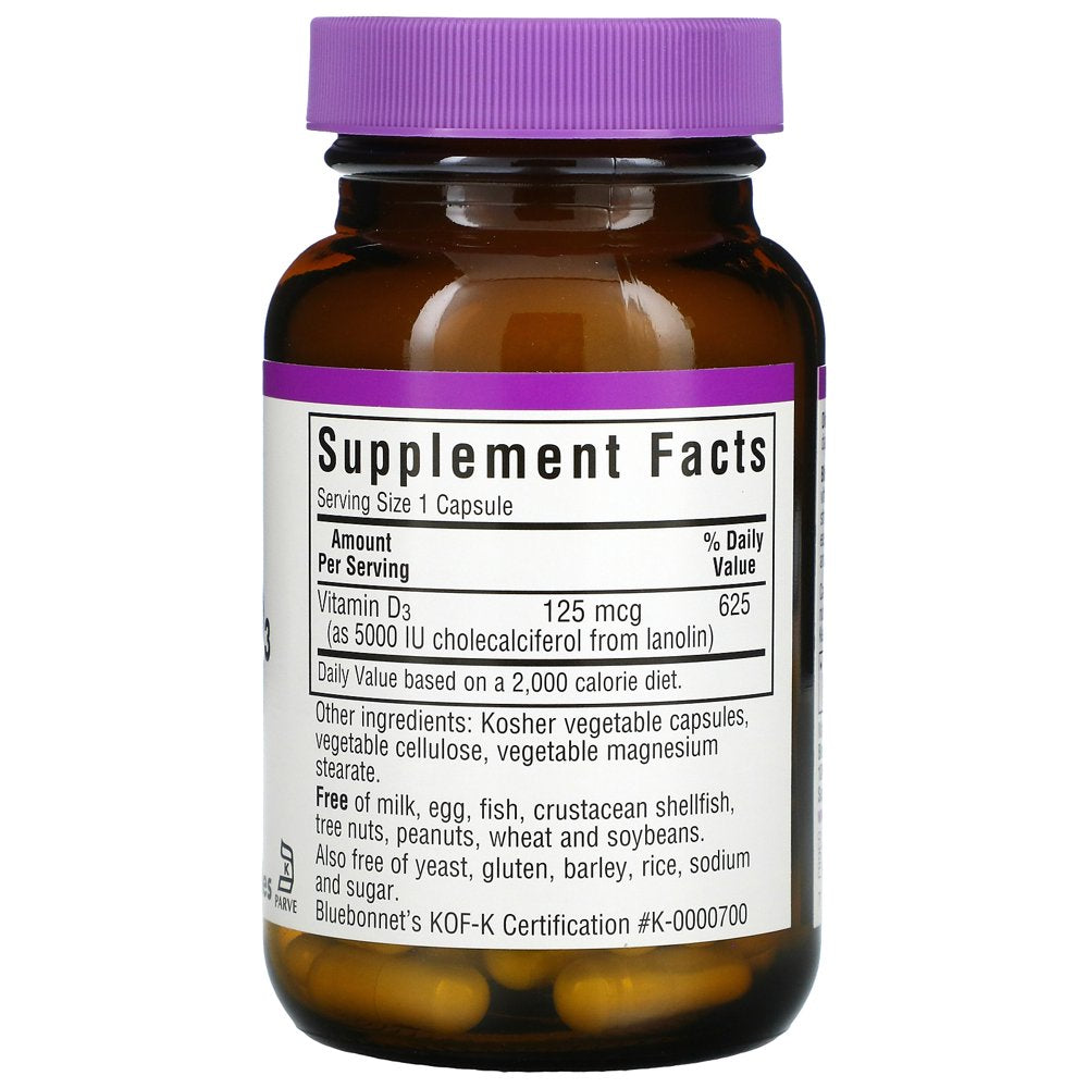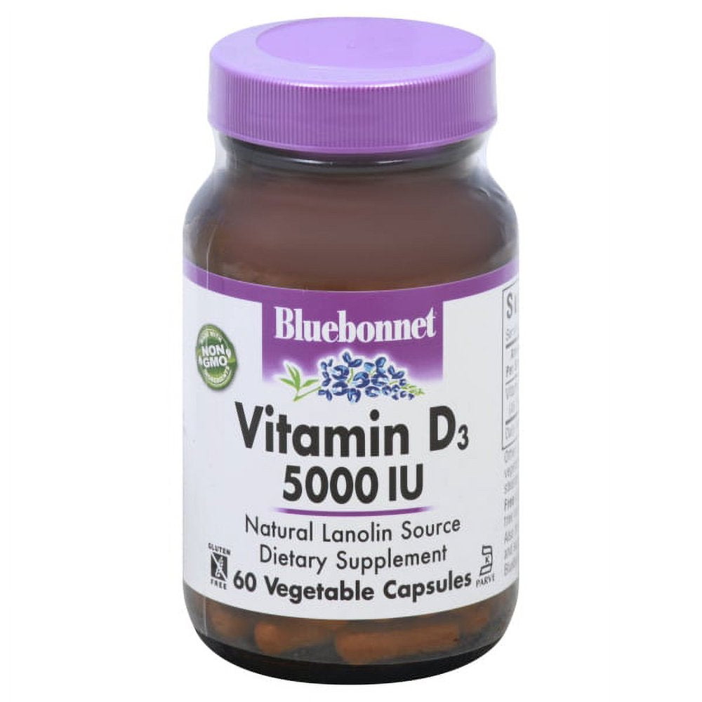 Bluebonnet Nutrition - Vitamin D3 5000 IU - 60 Vegetarian Capsules Bluebonnet?s Vitamin D3 5000 IU Capsules provide natural vitamin D3 (cholecalciferol) from lanolin. Available in easy-to-swallow vegetable capsules for maximum assimilation and absorption. VitaminsVitamins differ from macronutrients like carbohydrates, proteins and fats by virtue of the amount required. Typically, minuscule amounts are needed in comparison. Plus, vitamins are not used as an energy source. Instead, they are critical for the normal functioning, growth, repair and maintenance of cells and tissues and are required in individual units rather than long chains of smaller units. However, like carbohydrates, proteins and fats, vitamins are organic compounds, meaning that they are carbon-containing and are essential to one's overall well-being. In fact, a deficiency of just one vitamin can have a profound effect on the body and health. Vitamin D is a fat-soluble nutrient that requires conversion in the liver