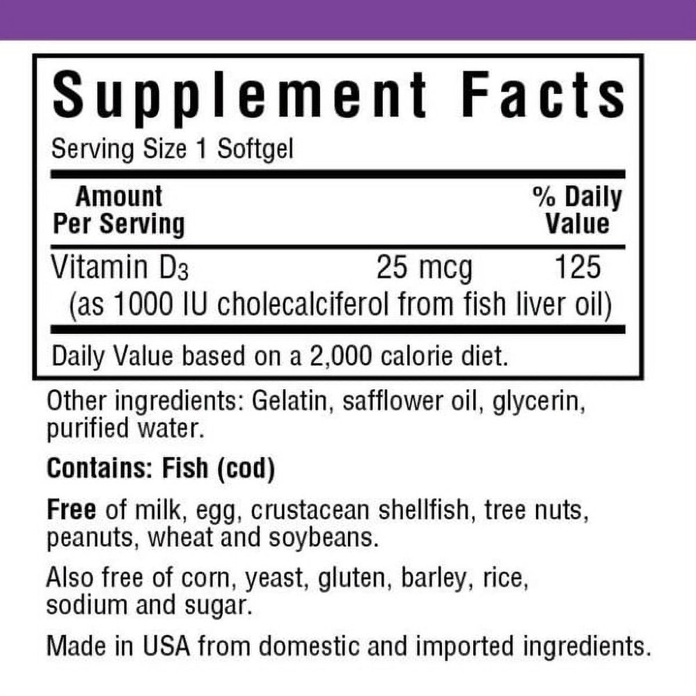 Made with Non GMO Ingredients From Fish Oil Dietary Supplement Soy Free Gluten Free Bluebonnet's Vitamin D3 1000 IU (25 mcg) Softgels are formulated with vitamin D3 (cholecalciferol) that supports strong healthy bones and immune function from molecularly distilled, deep sea, cold water, fish liver oil in a base of non-GMO safflower oil.
