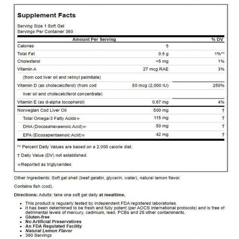 Carlson Labs Solar D Gems D3 2000 IU 360 Soft Gels Supplement Facts Serving Size: 1 Soft Gel Servings Per Container: 360 Amount Per Serving %DV Calories 5 Calories from Fat 5 Vitamin D3 (cod liver oil & cholecalciferol) 2000 IU 500% Vitamin E (d-alpha tocopherol) 1 IU 3.3% Norwegian Cod Liver Oil 500 mg * Total Omega-3's 115 mg * DHA (DocosaHexaenoic Acid) 50 mg * EPA (EicosaPentaenoic Acid) 42 mg * Omega-3's 23 mg * *Daily Value Not Established.†Percent Daily Values are based on a 2,000 calorie diet. Your diet values may be higher or lower depending on your calorie needs. Other Ingredients: Natural lemon flavor. Soft Gel Shell: Beef gelatin, glycerin, sorbitol, water./div>