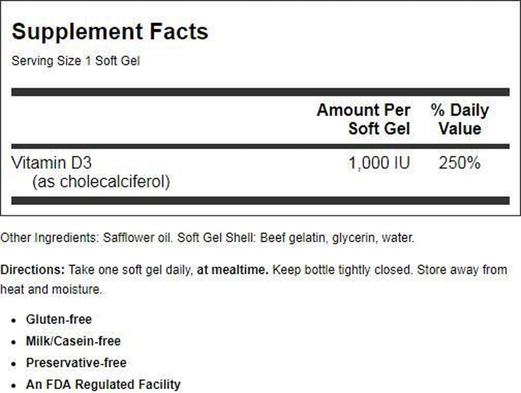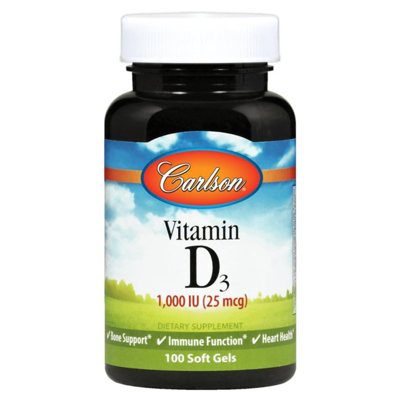 Carlson Vitamin D3 1,000 IU is the preferred form of vitamin D. Higher levels of vitamin D3 in the blood are associated with strong bones and good health, as well as a strong immune system. Vitamin D3 also helps to regulate calcium and phosphorus metabolism. Each soft gel provides 1,000 IU of vitamin D3.