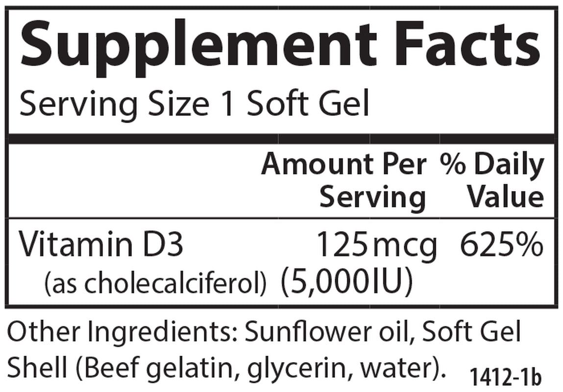 • 5,000 IU (125 mcg) of vitamin D3 in a single soft gel