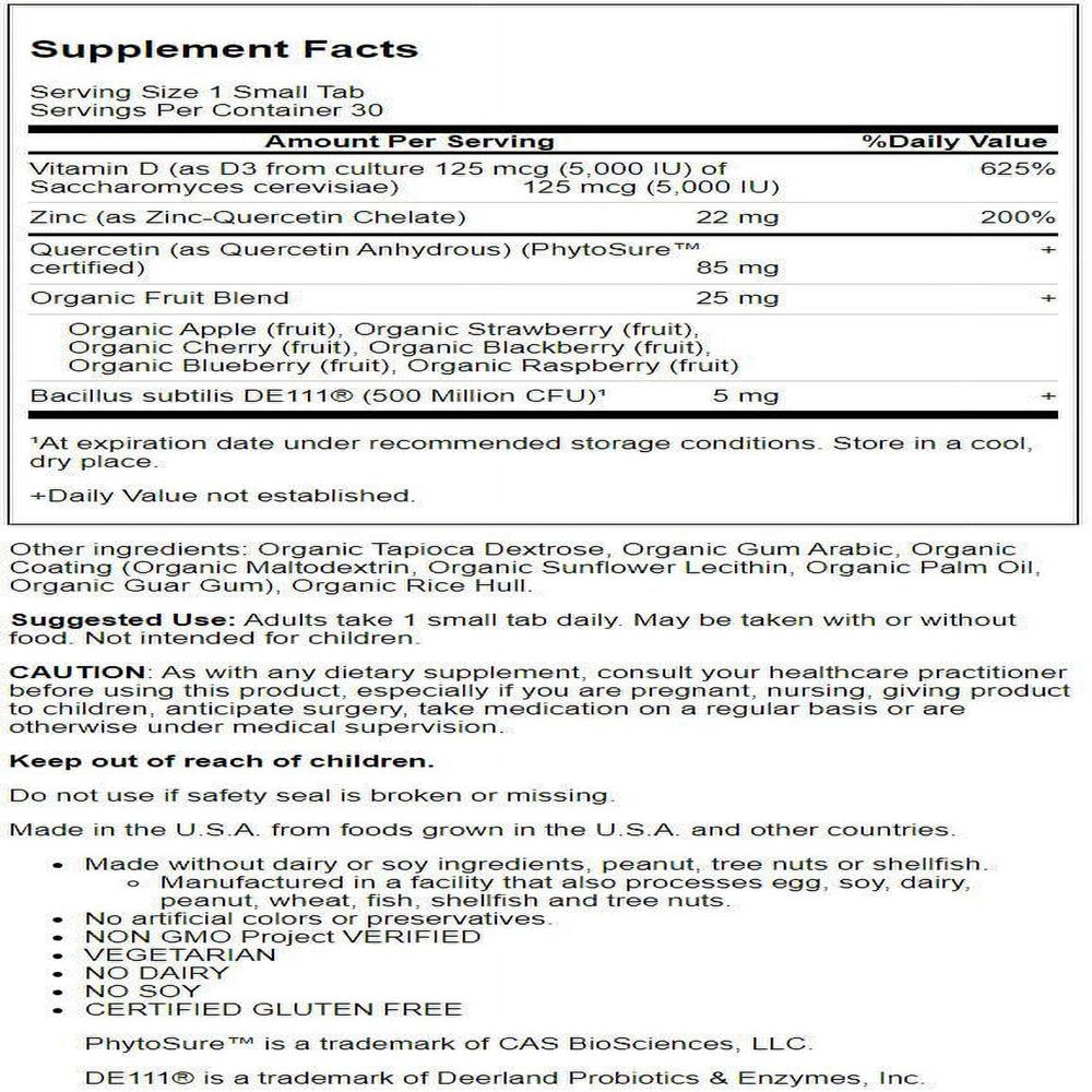 Vitamin D (as D3 from culture 125 mcg (5,000 IU) of Saccharomyces cerevisiae) 125 mcg (5 625%,Zinc (as Zinc-Quercetin Chelate) 22 mg 200%/div>