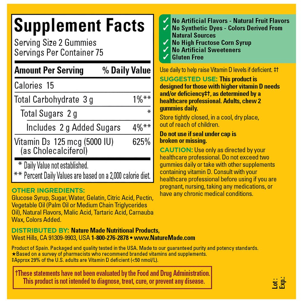 • Immune, muscle, teeth and bone health support supplement: contains one 150 count bottle of Nature Made Extra Strength Vitamin D3 5000 IU (125 mcg) per serving Gummies for a 75-day supply