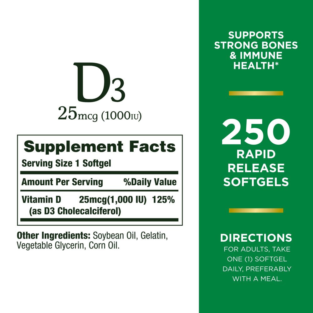 Nature’s Bounty Vitamin D3 1000 IU softgels offer simple and effective support for your immune system and promote whole-body health.* A potent and active form of Vitamin D, Vitamin D3 aids in calcium absorption and helps adults maintain healthy bones.* Nature’s Bounty Vitamin D3 also provides the benefits of sunshine that you may miss out on by living and working indoors, helping to combat the effects of seasonality on your body’s Vitamin D levels.* The vitamin experts at Nature’s Bounty combine science, nature and 50 years of expertise and innovation to provide the easiest way to increase your daily intake of this essential nutrient. Simply take one softgel daily, preferably with a meal. Searching for Vitamin D3 supplements that fit your specific dietary needs? Our rapid-release Vitamin D3 softgels are non-GMO, gluten free, sugar free, and contain no artificial colors or sweeteners. Each pack contains 250 rapid-release softgels.