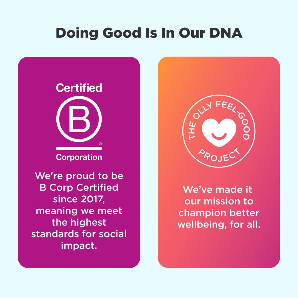 At OLLY, wellness is at the center of everything we do. That's why we've made it our personal mission to make nutrition easy to understand, so you can pursue good health without compromise. We do it by crafting products that are just as effective as they are delightful and delicious. Because we know when something feels good, you're a lot more likely to do it.