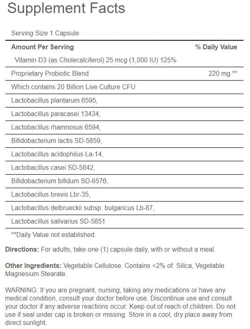 • Each capsule contains our proprietary probiotic blend that includes 20 billion live active cultures; each bottle contains 60 rapid release capsules