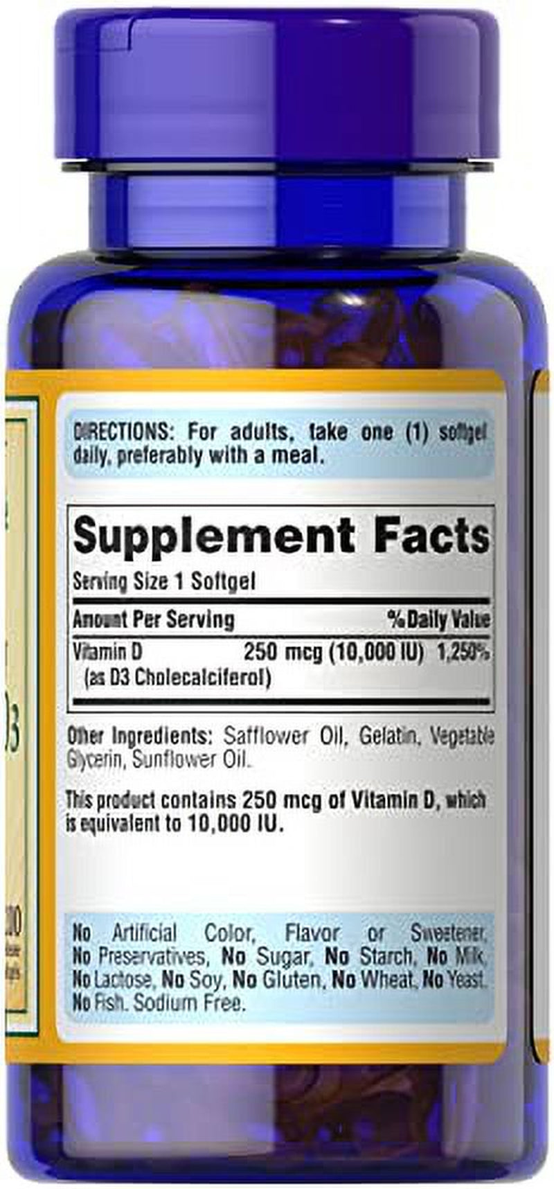 Puritan's Pride Vitamin D3 250 mcg (10,000 IU)-200 Softgels, White