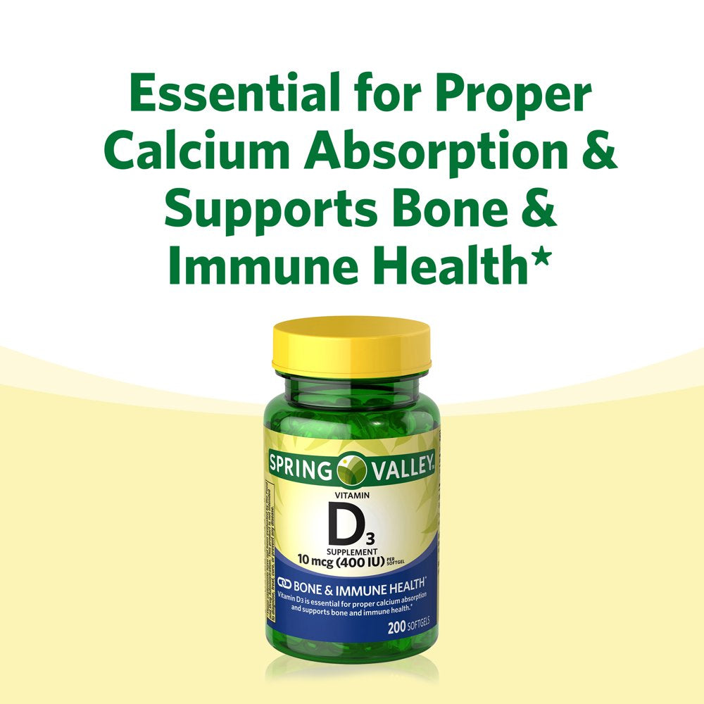 Spring Valley Vitamin D3 Supplement, 10 mcg (400 IU) is a supplement designed to promote bone and immune health. Vitamin D3 is essential for proper calcium absorption and supports bone and immune health. The suggested adult dosage is one softgel per day, preferably with a meal. They contain no gluten, yeast, wheat, milk or milk derivatives, lactose, sugar, preservatives, artificial colors, or flavors, and they contain less than 5 milligrams of sodium per serving. You can rest assured that Spring Valley Vitamin D3 Supplement, 10 mcg (400 IU) is produced with strict quality guidelines and is backed by our quality guarantee.