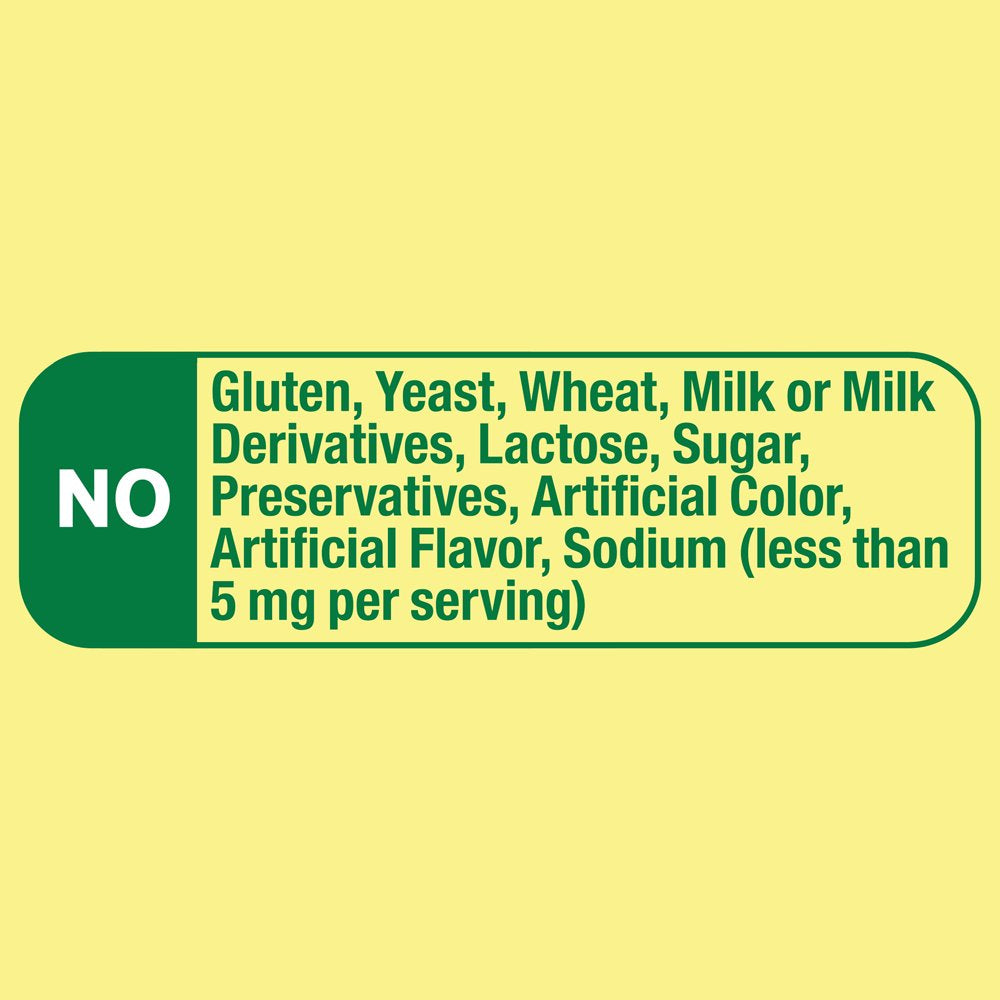 No gluten, yeast, wheat, milk or milk derivatives, lactose, sugar, preservatives, artificial color, artificial flavor, sodium (less than 5 mg per serving)