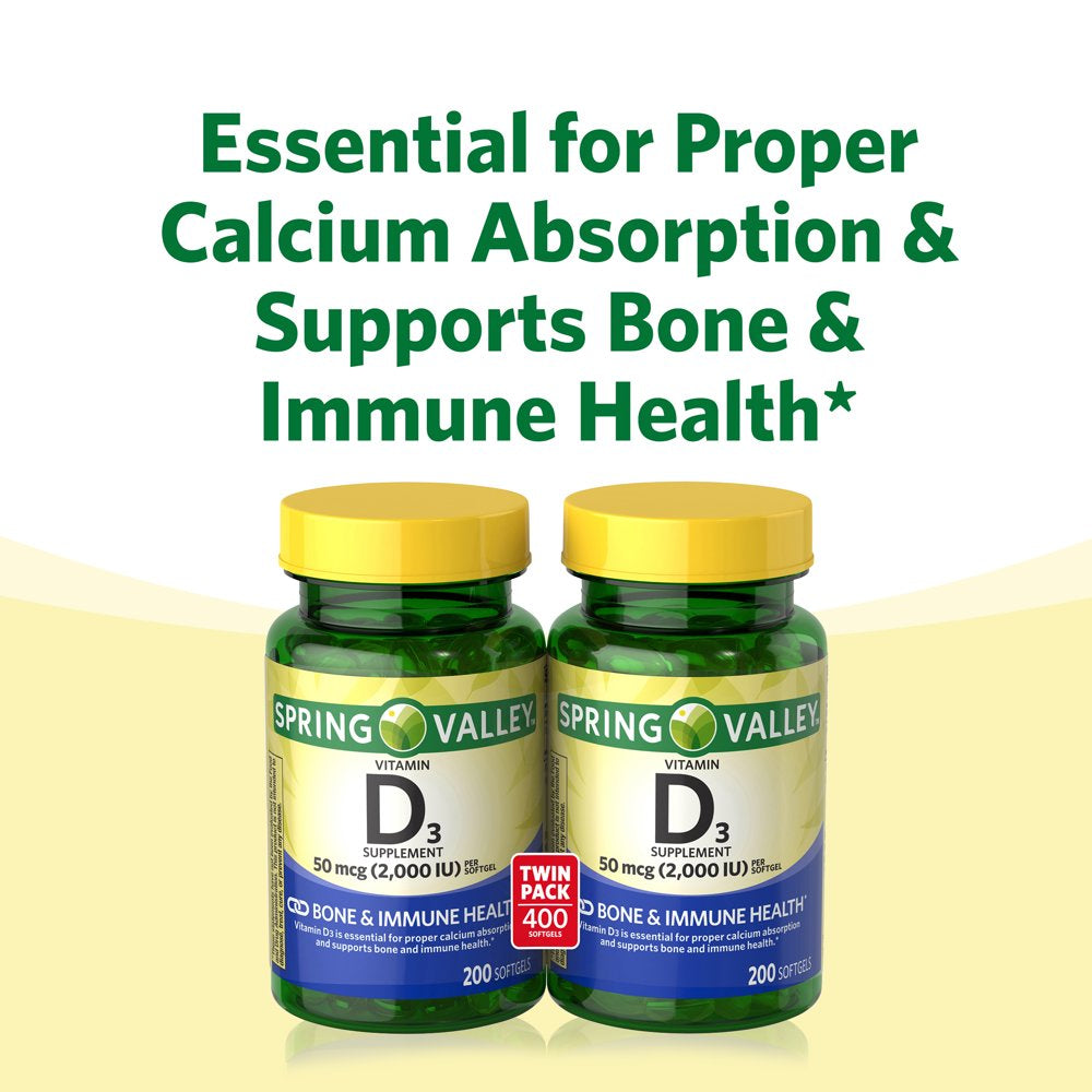 Spring Valley Vitamin D3 Supplement Twin Pack, 50 mcg is a supplement designed to promote bone and immune health. Vitamin D3 is essential for proper calcium absorption and supports bone and immune health. The suggested adult dosage is one softgel per day, preferably with a meal. They contain no gluten, yeast, wheat, milk or milk derivatives, lactose, sugar, preservatives, artificial colors, or flavors, and they contain less than 5 milligrams of sodium per serving. You can rest assured that Spring Valley Vitamin D3 Supplement Twin Pack, 50 mcg is produced with strict quality guidelines and is backed by our quality guarantee.