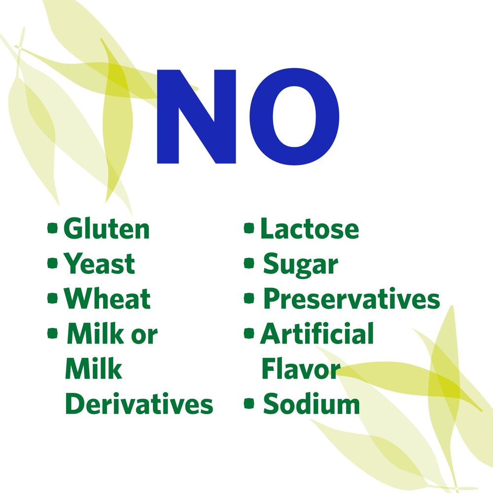 - No gluten, yeast, wheat, milk, lactose, or sugar