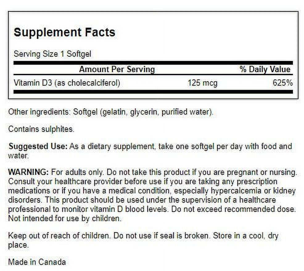Adequate vitamin D intake is essential for optimal health, but getting enough vitamin D from your diet or through sun exposure is difficult for many people. Additionally, our ability to produce vitamin D diminishes with age. According to the National Institutes of Health, most people in the United States consume less than recommended amounts of vitamin D. Get the sunshine vitamin in a softgel with Swanson Vitamin D3--our most biologically active form of D3. Vitamin D benefits range from calcium absorption and bone-building benefits to supporting immune , cardiovascular and nervous system function. Optimal levels are associated with improved muscle strength and blood pressure maintenance. Vitamin D supplements may even promote a healthy mood, bringing more light to the sunshine vitamin. Our easy-to-swallow softgels deliver 125 mcg (5,000 IU) per serving of vitamin D3 (as cholecalciferol).