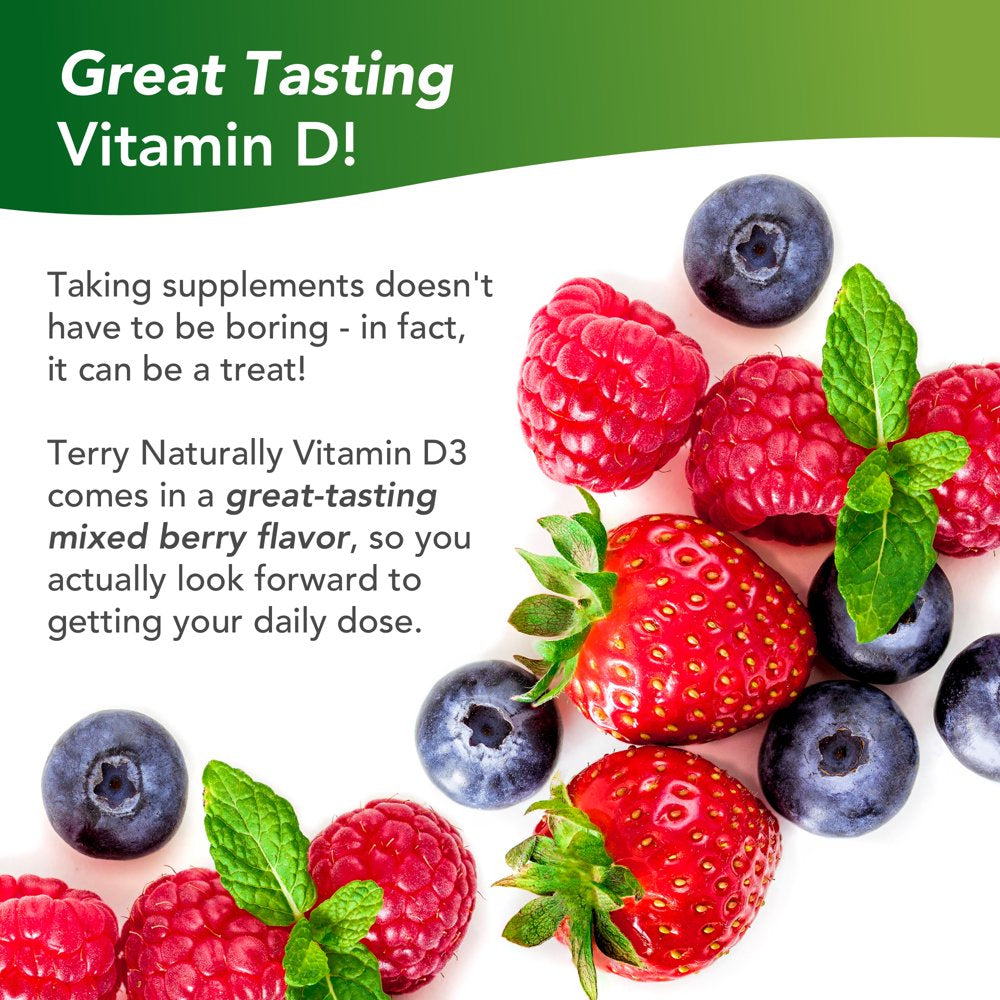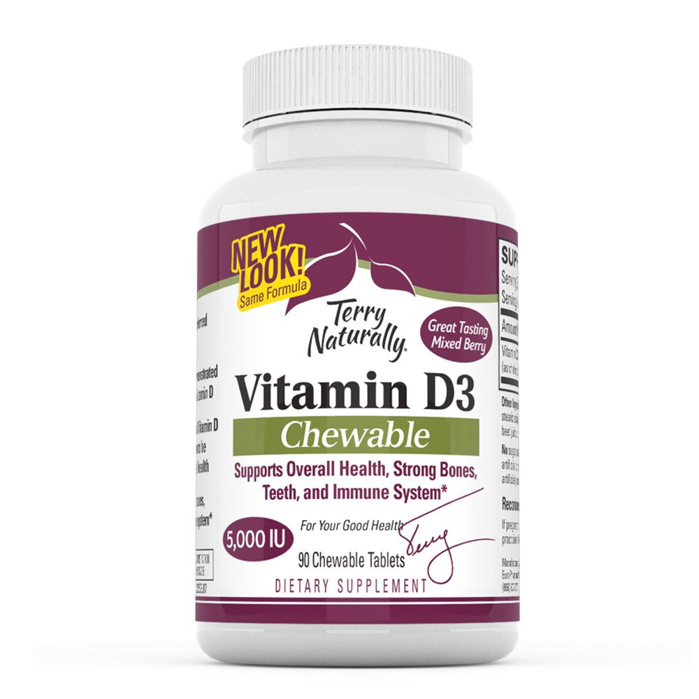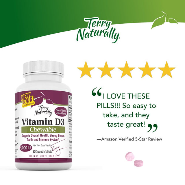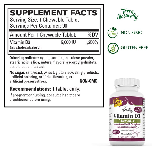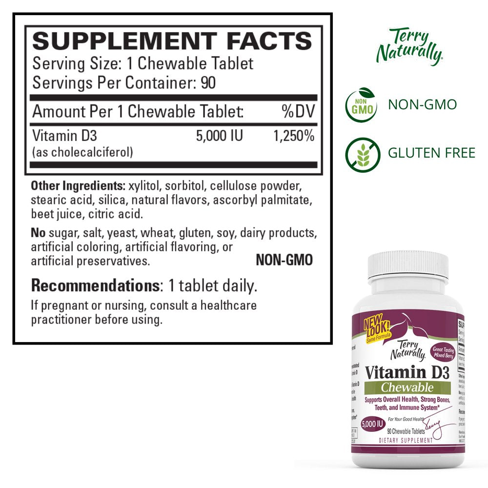 Terry Naturally Vitamin D3 - 125 mcg Cholecalciferol, 90 Chewable Tablets - Supports Strong Bones & Teeth, Healthy Immune System - Non-GMO, Gluten-Free - 90 Servings