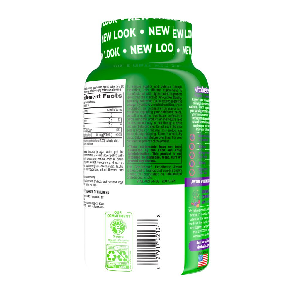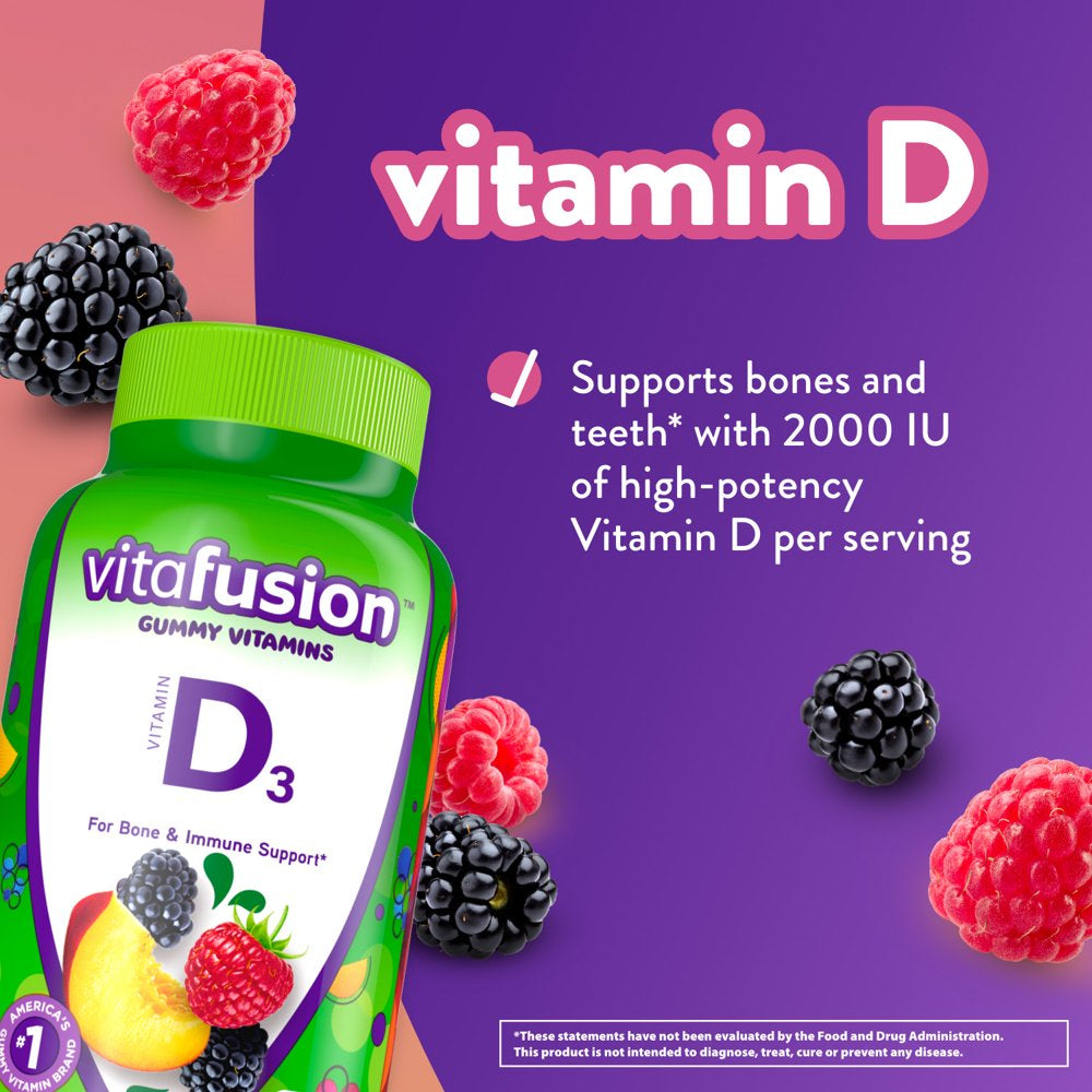 Vitafusion Vitamin D3 Gummy Vitamins are vitamin gummies that help support bones, teeth and the immune system (1). Each delicious two-gummy serving provides a great-tasting and convenient alternative to traditional, hard-to-swallow vitamin pills. Vitafusion believes that taste and nutrition can be fused together, ensuring that taking your dietary supplement is an easy and delicious part of your day. Vitamin D, also known as the sunshine vitamin, aids in the absorption of calcium for teeth and bone health and provides immune support (1). Each serving of these vitamin gummies provides 50 mcg (2,000 IU) of Vitamin D, 250 percent of the recommended daily value. These flavorful and nutritious vitamin gummies are made with no artificial flavors or sweeteners, no gluten, no high-fructose corn syrup, no dairy and no synthetic FD&C dyes. This 150-count bottle of Vitamin D dietary supplement gummies ensures you’ll have enough to last you 75 days. Vitafusion is the only gummy vitamin brand with products that have been awarded the ChefsBest Excellence Award for taste. (2) Take a fruitful step toward a healthier, happier world with America’s #1 Gummy Vitamin Brand.(1) These statements have not been evaluated by the Food and Drug Administration. This product is not intended to diagnose, treat, cure or prevent any disease. (2) The ChefsBest Excellence Award is awarded to brands that surpass quality standards established by independent professional chefs. Evaluation funded by Church & Dwight Co., Inc.